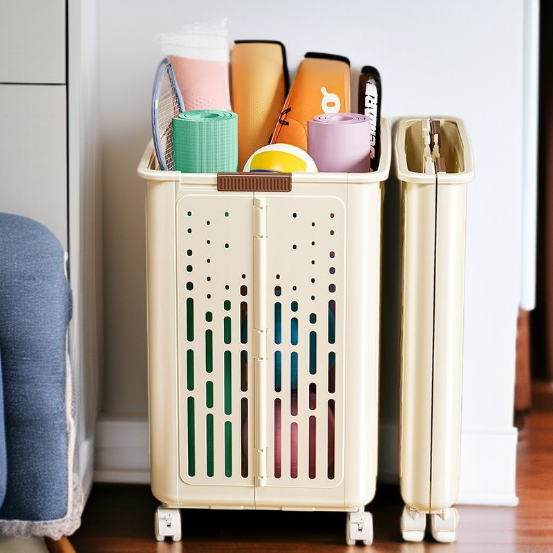 Multi-functional storage basket with wheels for easy movement. Organizes sports tools, badminton, roller skates, and fitness equipment. Durable material, space-saving design, suitable for home use.